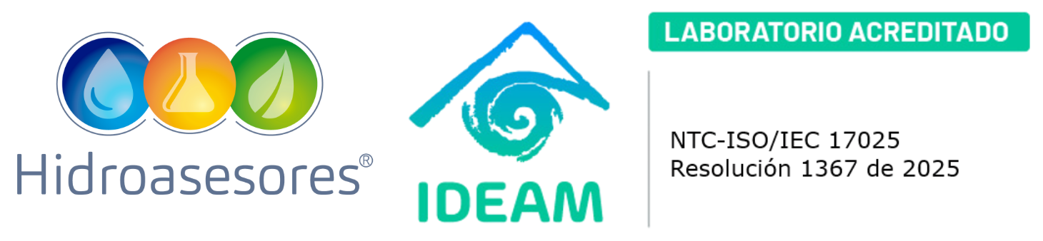 HIDROASESORES S.A.S es una organización acreditada por el IDEAM bajo la norma NTC-ISO/IEC 17025:2017 según la Resolución 1367 del 06 de noviembre del 2025, de acuerdo al siguiente alcance: Toma de muestras simples, compuestas e integradas de aguas residuales, cuerpos lóticos, cuerpos lénticos y aguas subterráneas, con medición en campo de pH, conductividad, caudal, temperatura, oxígeno disuelto y sólidos sedimentables. Acreditación para análisis en laboratorio de alcalinidad, cloruro, sulfato, dureza total, dureza cálcica, nitrato, nitrito, fósforo total, fósforo reactivo disuelto (leido como ortofosfatos), sólidos suspendidos totales, sólidos disueltos totales, sólidos sedimentables, DBO, DQO, sulfuro, turbidez, acidez, cianuro total, surfactantes aniónicos (SAAM), color verdadero, aceites y grasas, hidrocarburos, formaldehído, calcio, magnesio, floruro, nitrégeno amoniacal, nitrógeno kjeldahl y nitrógeno total. Acreditación en matriz biota para ecosistemas lóticos y lénticos para toma de muestras y análisis cuantitativo y cualitativo de las comunidades de fitoplancton, zooplancton, perifiton, plantas macrófitas, macroinvertebrados bentónicos, macroinvertebrados asociados a macrófitas y peces.